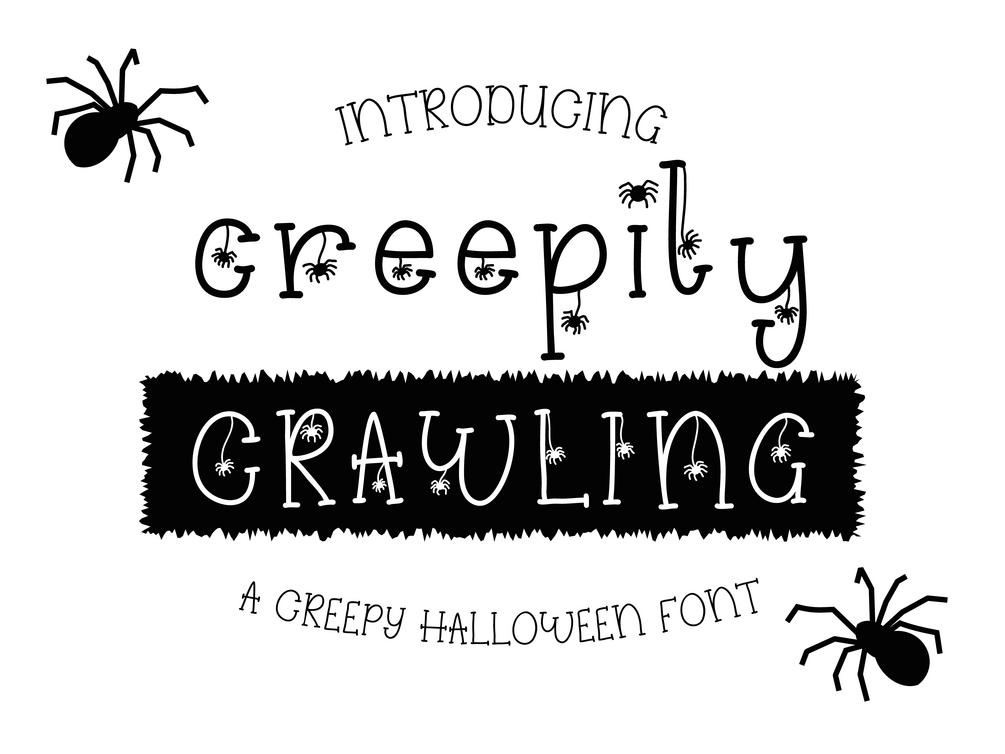 Creepily Crawling is a halloween font with a creepy spiders design. Perfect for a wide range of applications such as party invitations, flyers, banners, & halloween displays.